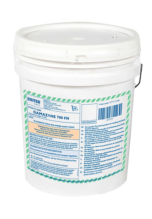 Unitor™ Gamazyme 700FN is formulated to degrade excess residual waste products in shipboard sanitation pipe work systems, holding tanks and marine sewage treatment plants. The specialised strains in Unitor™ Gamazyme 700FN will digest grease, fats, sewage, starch and other organic compounds. The degradation of paper, protein and waste product residuals is greatly increased, and the odours that these produce, are reduced.