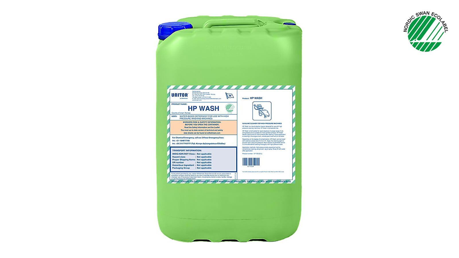 Unitor™ H.P. Wash is a phosphate free cleaner, designed for use with high pressure cleaning machines such as Unitor™ High Pressure Cleaners. It is also suitable for hot or cold high pressure spray equipments.